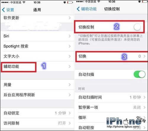 2、進入通用設置後,我們再進入“輔助功能”設置,之後在進入“切換控制”設置。然後先開啟切換控制功能,之後再點擊進入具體的切換功能選擇設置,如下圖所示: