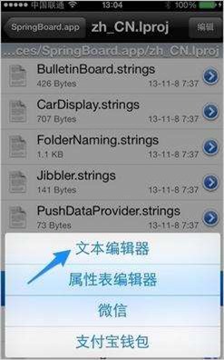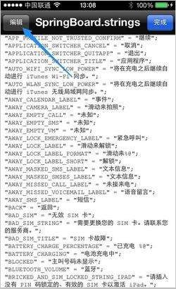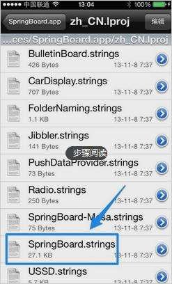 回到了系統的根目錄下,我們依次進入 /System/Library/CoreServices/SpringBoard.app/zh_CN.lproj 下,找到 zh_CN.lproj 目錄下的 SpringBoard.strings.plist 文件: