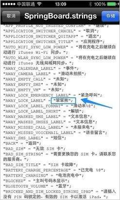 在編輯模式中,找到這一行 "AWAY_LOCK_LABEL" = "滑動來解鎖" 字樣,在緊急呼叫一行的下面: