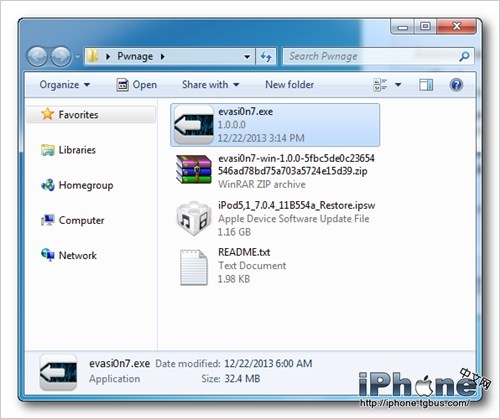 在桌面建立Pwnage文件夾,並且下載最新版的eavsi0n工具並放入文件夾內。同時我們比較推薦下載iOS7.0.4最新固件進行重新刷寫。