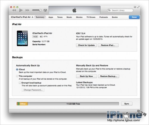將你的iPad設備鏈接到電腦並且手動進行備份。