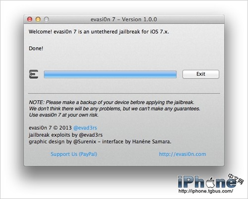 進度完成之後會詢問是否解鎖設備,並且會要求用戶點擊在設備上出現的evasi0n7應用圖標。點擊之後程序會直接閃退,別緊張這很正常。