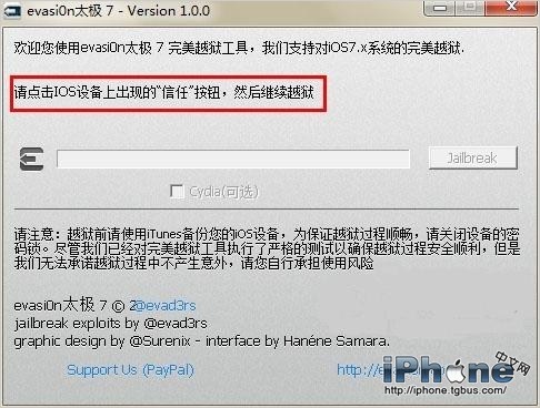 進度完成之後會詢問是否解鎖設備,並且會要求用戶點擊在設備上出現的evasi0n7應用圖標。點擊之後程序會直接閃退,別緊張這很正常。
