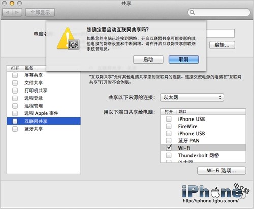 都完成後在左邊互聯網共享前面的選擇框內打鉤,啟用共享。