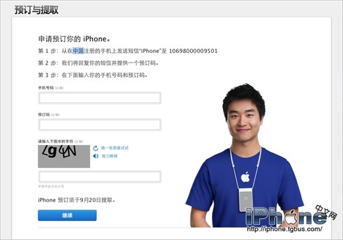 按照頁面提示,使用自己的手機發送信息iPhone到106980000009501,並填寫收到的驗證碼。