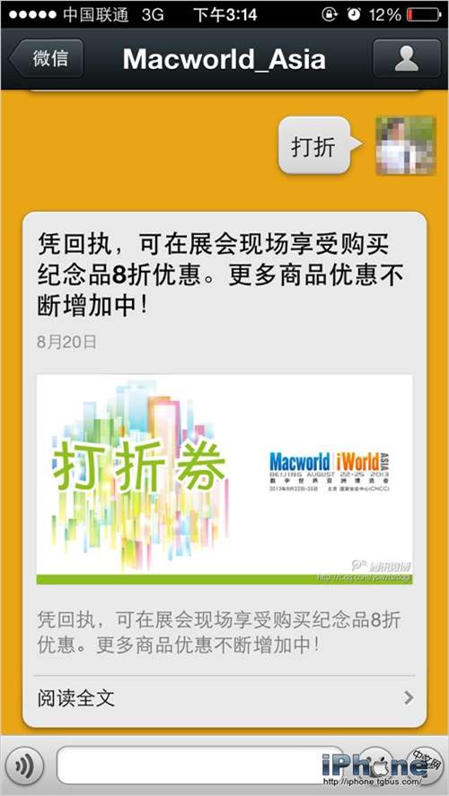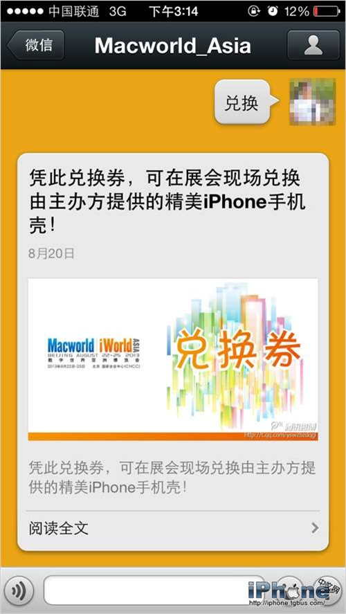 如果你回復的是“兌換”,官方微信會為你提供兌換券,你可以憑此券去現場兌換由主辦方提供的精美iPhone手機殼: