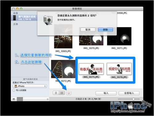 使用ImageCapture來刪除iPhone中的照片,只需要簡單的三步,選擇,刪除,確認。比起iPhoto,實在是方便多了 。