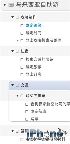 大多數GTD軟件都不支持項目的無限層級,Things因為這一點一開始就沒在我的考慮范圍之內。很多人認為如果任務不復雜的話,就不需要無限層級了。但事實上,無論是生活上還是工作上,即使我這樣的普通人也會覺得一兩個層級根本不夠用,比如安排一次自助游,這是每個人都可能會遇到的超級復雜的項目,類似還有裝修,舉辦婚禮等等,無限層級在這樣的項目面前是必須的。