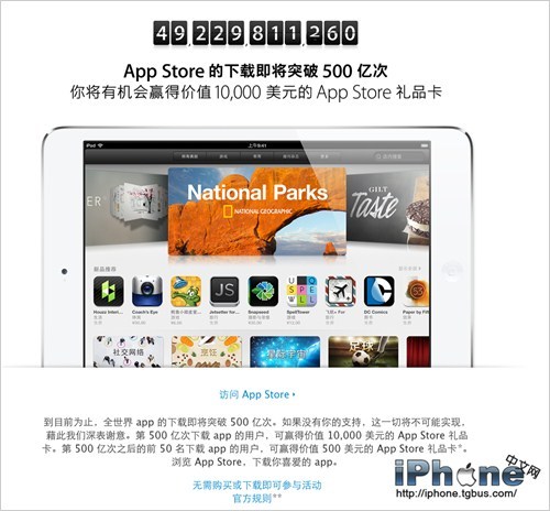 蘋果近日再次推出iTunes下載次數500億次抽獎活動,在iTunes第500億次下載應用的用戶,將得到價值10000美元的iTunes兌換卡。而第500億次下載之後的50名用戶,也可以得到500美元的兌換卡,以作獎勵。