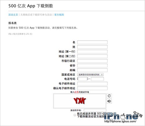 除此之外,其實蘋果還特別為用戶准備了一個抽獎通道,用戶即使不下載,也有可能中獎。只要前往這個網頁:http://www.apple.com.cn/itunes/50-billion-app-countdown/entry-form/ ,按要求填寫詳細的資料,即可參加抽獎。每人每天,可以填寫25次表格,增加自己的中獎機會。