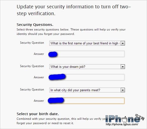 首先會被要求設置三個安全問題,因為二次驗證關閉後安全問題就是替代的驗證手段了。按要求填好安全問題並牢記答案,最後點擊最下角的藍色按鈕繼續。
