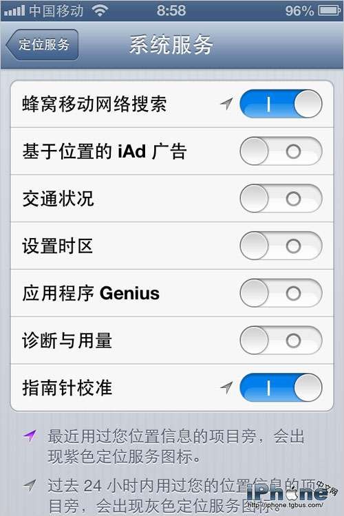 進入iPhone“設置”菜單,選擇“隱私”-“定位服務”,打開最下面的“系統服務”,關閉“基於位置的iAD廣告”和“設置時區”等一系列沒用的功能,只保留“蜂窩移動網絡搜索”和“指南針校准”即可。如下圖所示: