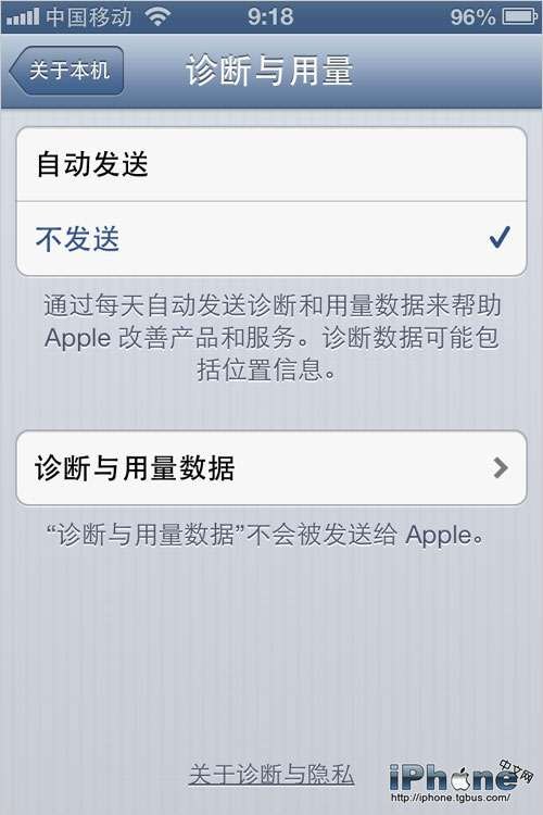“設置”-“通用”-“關於本機”-“診斷與用量”,選擇“不發送”,節省發送數據給Apple帶來的流量。