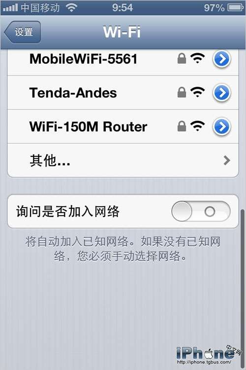 “設置”-“Wi-Fi”,關閉“詢問是否加入網絡”。