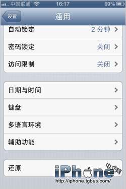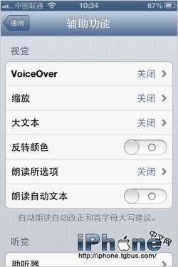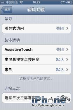 iOS5中開始加入了一個新功能:輔助手勢。這項功能被安排在了設置->通用->輔助功能中的“AssistiveTouch”類別中,進入後選擇開啟即可。