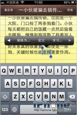 iOS中的備忘錄功能估計大家平時都會使用,偶爾遇到字義不太肯定時便需要通過字典來解決問題。其實大家在這裡僅需選擇指定字、詞內容後點擊定義即可查看系統自帶字典的解釋。