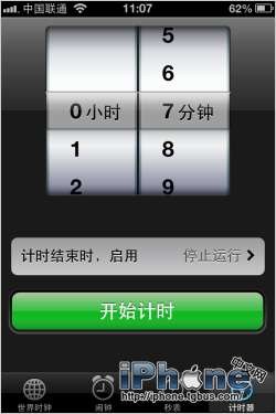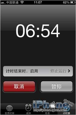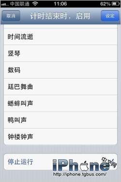 其實解決這個問題的辦法需要借助另一個程序,便是系統中時鐘的計時器功能,選定好時間後大家還需要選擇結束計時時啟用“停止運行”的選項,這樣在計時器完成後便可以自動停止所有運行的軟件,當然包括iPod。