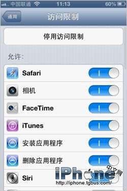 打開這個功能的順序為通用->訪問限制->啟用訪問限制即可,想要屏蔽哪個應用就看大家自己需求了。