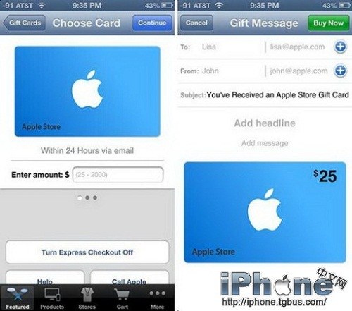 首先,用戶可以從 Apple Store 應用底下的“Featured”進入購買禮品卡。用戶可以選擇各種類型的禮品卡,這些禮品卡都可以在蘋果實體店或者蘋果在線商店消費。目前用戶可以選擇的禮品卡顏色僅限藍色、銀色和粉色,面值最小 25 美元,最高 2000 美元。選購好禮品卡後,用戶可以將卡寄發給好友的實體地址,或者電子郵箱地址。此功能也可以購買 iTunes 卡,但是 iTunes 卡只支持電子郵箱地址的發送。