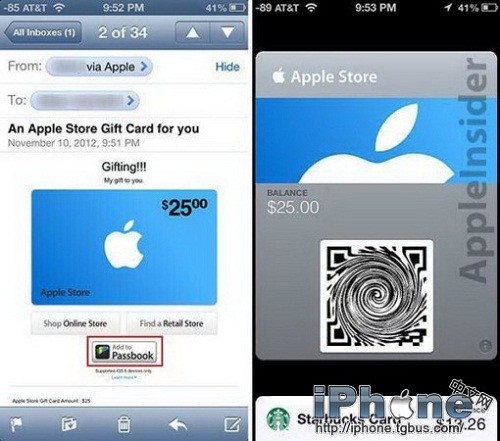 寄出去後,接收者可以從電子郵件打印出來,帶到實體店消費。或者登陸蘋果在線商店使用電子禮品卡消費。第三種方法是,將禮品卡下載到 Passbook,保存起來,然後前往蘋果零售店刷一下 iPhone 就能消費了。如截圖所示,在郵件中蘋果添加了一個 “ Add to Passbook ”的按鍵。Passbook 保存下來的禮品卡是作為 QR 碼存在,可直接刷 iPhone 消費。