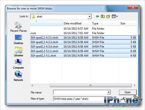 在出現的選擇框中,選擇保存在本地的SHSH文件(可以多選),點擊Open打開(小雨傘會備份在.shsh目錄中,使用系統搜索功能即可找到該目錄和對應的文件)