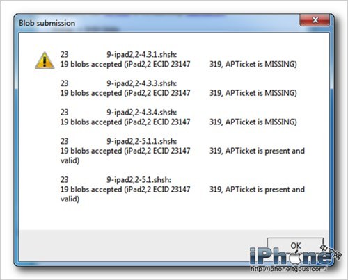 在上傳完成後,Redsn0w會告訴你那些版本的SHSH被成功上傳備份。