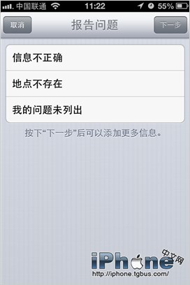 選擇“報告問題”之後,我們可以報告“信息不正確”或者“地點不存在”,還可以選擇“我的問題未列出”,發送自定義的錯誤信息。