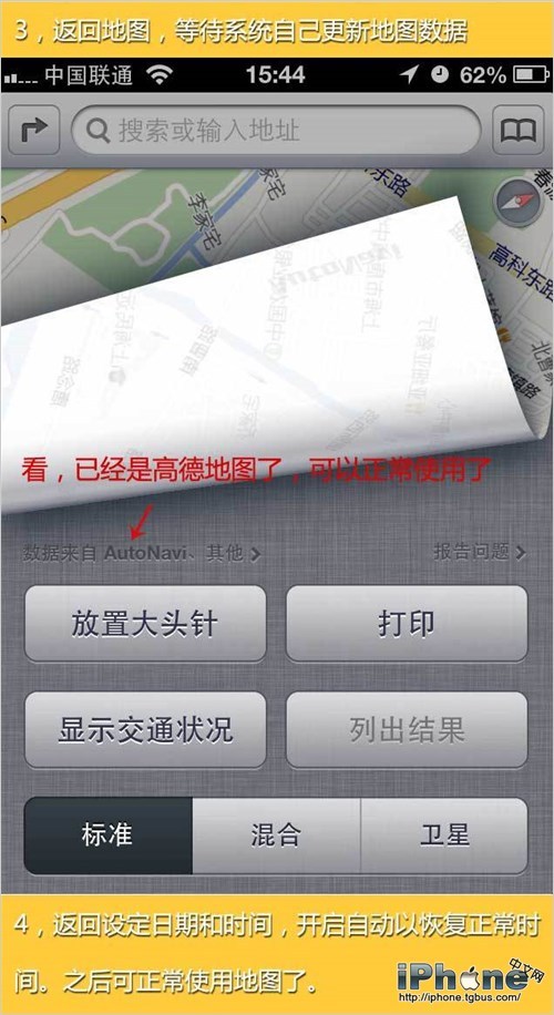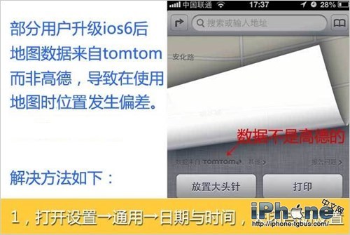 部分用戶在升級到iOS6後,在國內使用時,會出現地圖定位偏移的情況。這種問題主要是由於用戶在升級iOS6時,選擇了國外的AppleID進行激活,或在某種情況下,被默認使用了國外Tomtom的地圖數據。對此,我們可以使用手動更新的方式,讓iOS6改回使用國內的高德地圖數據,以解決地圖定位偏差的問題。