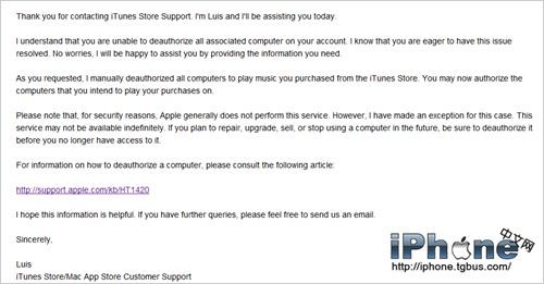 I want to deauthorize all the computers of the Apple ID(把你的帳戶名字寫在這裡) , because I have already done the 'deauthorize all' option this year.And 2 month's waiting for another chance it's too long to buy iTunes Match sevice.(這裡描述一下理由,我是為了購買 iTunes Match,你可以寫一下你的,比如你的馬子把你的帳號貼到口袋巴士論壇上了)