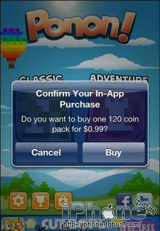 第三步: 打開包含In-App Purchase的應用,試著買點金幣啊,道具什麼的,並不是真買,彈出確認購買【Confirm Your In-App Purchase】的對話框後點擊【Cancel】取消購買,退出App。