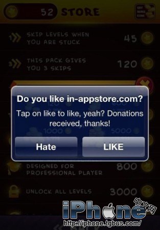 搞定!現在在App中購買道具什麼的會彈出【Do you like in-appstore.com?】,點擊【like】完成應用程序內購買,如果需要輸入itunes賬號密碼,隨便輸入例如“1234”,不用輸入真實的密碼。