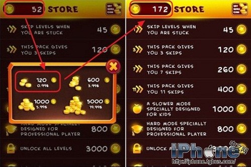 看看效果,測試應用為Ponon! DELUX。左圖左上角的金幣為52,然後買了120個金幣,變成了172個金幣。而這個過程並沒有登陸iTunes賬號,所以實際消費為0,應用程序內購買破解成功!另測試移除AppShopper廣告成功。