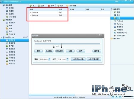 不過沒關系,iTools還提供制作鈴聲功能,可以方便的將Mp3等文件,修改成iPhone適合使用的鈴聲。