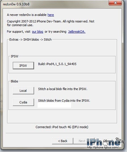 在iOS5.1越獄暫時無望的情況下,那些有幸在iOS5.0.1時代就已經越獄並保存SHSH的同學無疑是幸福的。但是在使用中,難免會遇到由於軟件沖突、插件安裝錯誤等問題造成的白蘋果等問題,我們又不得不進行恢復系統操作。在iOS5.1升級並不太大的情況下,保留在iOS5.0.1固件就成了很多人的選擇。之前我們介紹過使用TimyUmbrella小雨傘和iFaith自制固件工具等自制固件平刷iOS5.0.1的方法(iPhone4 使用SHSH備份平刷iOS5.0.1固件教程),但這一方法要使用多個工具,下面,小編就為大家介紹一種使用大家非常熟悉的紅雪Redsn0w 0.9.10b8b最新版,來實現iOS5.0.1固件平刷。
