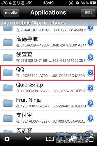 讓我們找到QQ2012的目錄,/var/mobile/Applications/,然後在這個界面中找到QQ。