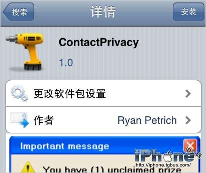 在安裝了ContactPrivacy之後,只要程序需要提取聯系人的話,iPhone就會自動彈出提示,讓用戶自己決定是否放行。如下圖所示,如果有程序需要加載聯系人的話,就會有這樣的友情提示。