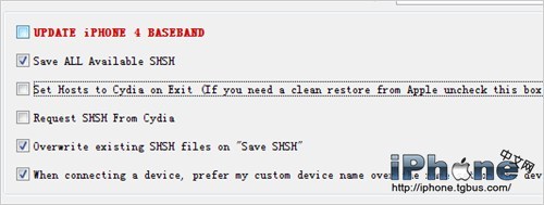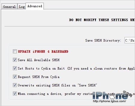 重要:在右下方的Advanced裡取消Set Hosts to Cydia on Exit和Request SHSH From Cydia這兩個選項!