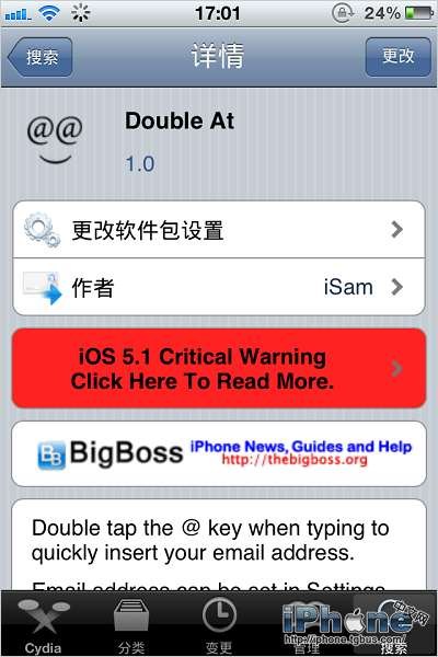 首先我們要進入Cydia,找到Double At。這是一款完全免費的插件,收錄於bigboss默認源中~