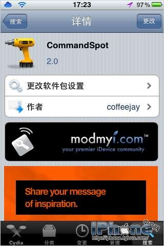 首先我們要進入Cydia,找到CommandSpot,點擊下載。這款插件收錄於bigboss默認源中,是完全免費的~!