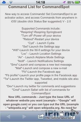今天六六為大家介紹的這款插件很有趣,可以通過輸入命令來達到不同的效果,而且它還允許用戶進行一定的系統操作,比如打開應用,重啟設備等等,不過這款插件需要依賴Activator來啟動。下面就隨六六一起來接觸這款插件吧!