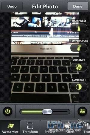 Camera Awesome 不但能夠幫人派出好照片,還能夠幫人處理出好照片。在編輯圖片的時候,它提供名為“Awesomize”的按鈕,和一個滑動條,讓人一鍵優化圖片。而如果用戶還覺得不滿意,還可以分別調整圖片的銳度、色溫、飽和度、對比度。