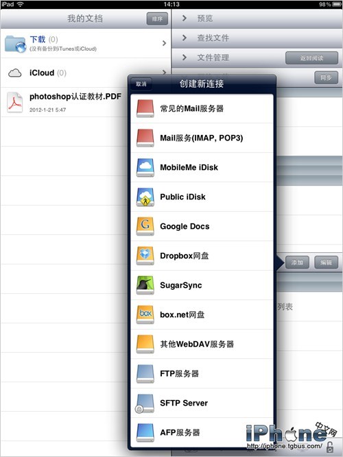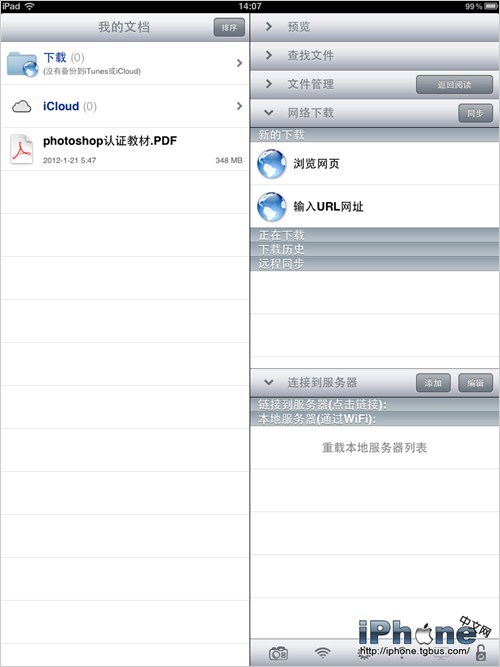 首先是如何將PDF等文件傳入GoodReader中,GoodReader內置了豐富的方法,以供用戶將PDF文檔載入。除了傳統的通過iTunes應用管理內自帶的文件傳輸功能外,GoodReader還支持通過Safari浏覽器直接下載PDF、應用內輸入PDF網絡下載地址下載、常見網盤同步下載、郵件附件下載等多種文件傳輸模式,在最新版本中,還內置了iCloud雲服務的支持,可以自定義設置同步和下載PDF文件。