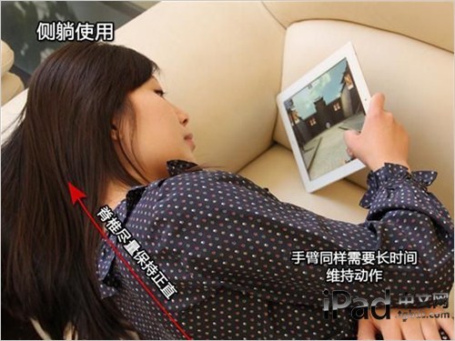 正確的使用方法是半靠在床上,有可能的話以抱枕保護整個後背。同時單腿支撐iPad,並用單手保持使用。姿勢保持在20-30分鐘左右後,另一只手與腿進行交替。