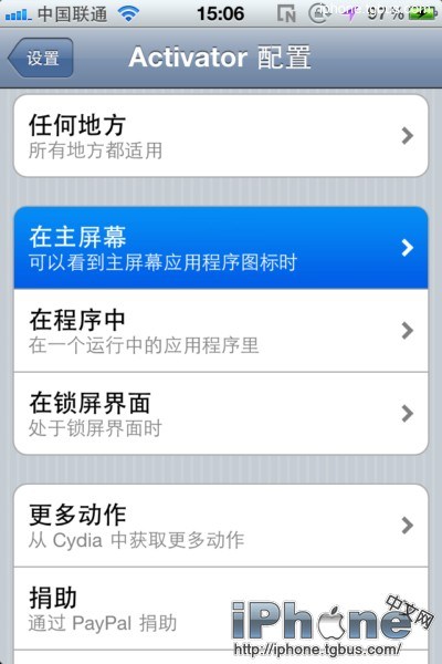 以啟動“新浪微博”為例, 由於我是微博控,我希望activator能讓我快速啟動“新浪微博”這一軟件,所以通過以下的設置,達到在主屏幕裡快速啟動新浪微博。