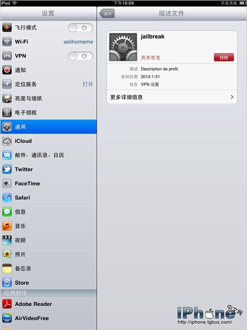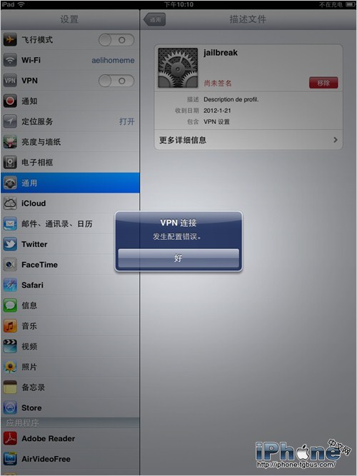 按提示開啟VPN選項,等待系統彈出VPN配置錯誤提示,iPad2會自動重啟。重啟後Cydia已經安裝成功。