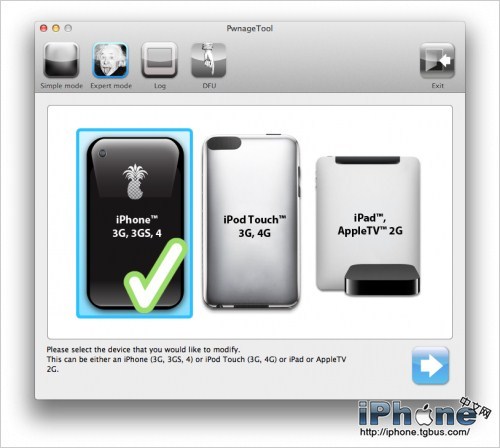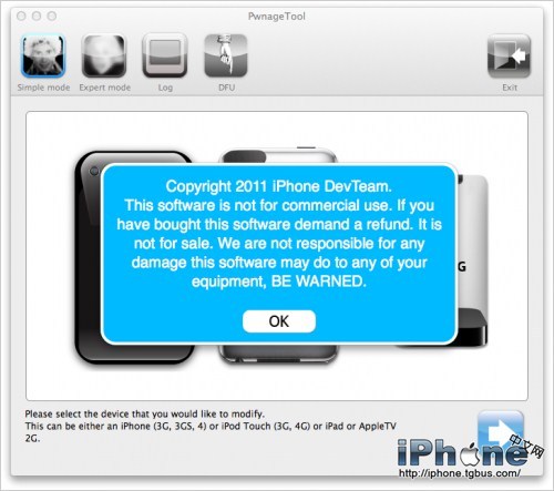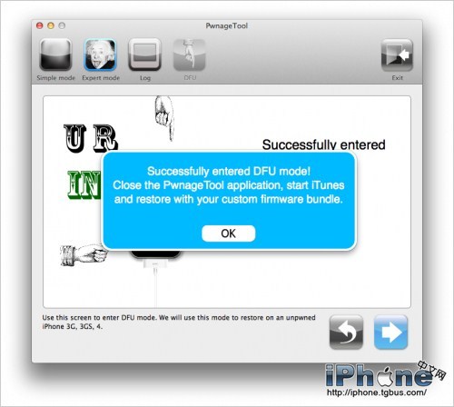 iPhone會進入DFU模式,PwnageTool提示你需要啟動iTunes。