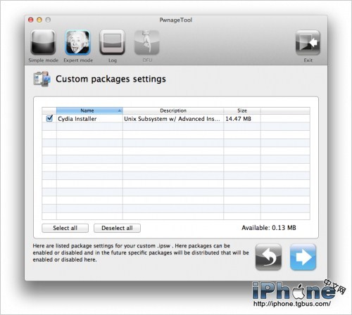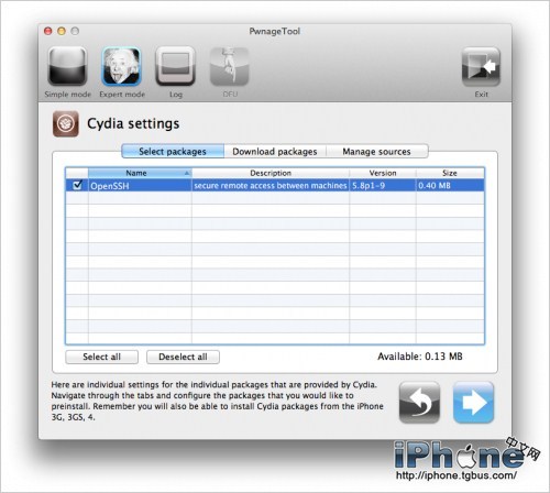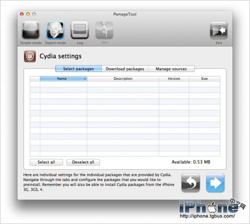 下面是Cydia商店的設置,可以添加自定義的安裝包,可以點擊“Download Packages”,浏覽可以下載的安裝包,並提前將其安裝到Cydia商店中,選擇安裝包後,點擊藍色箭頭繼續。