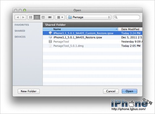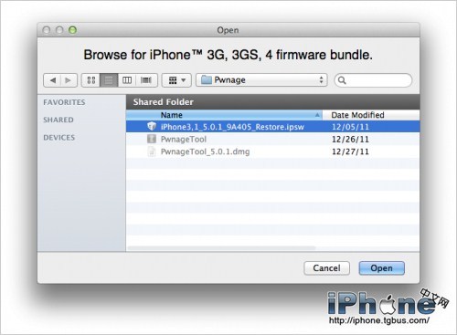 點擊“Browse for IPSW”,在彈出的文件夾裡選擇剛才創建的PwnageTool文件夾,選中其中的iOS5.0.1固件,點擊“Open打開”按紐。