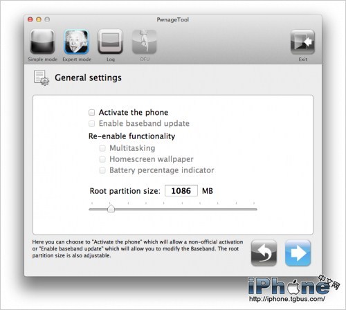 這裡會出現一些選項,如果需要自動激活請選擇“Activate the phone”選項,如果有有鎖機原版的官方SIM卡或不需要自動激活,請不要選擇這一選項(自動激動可能導致Facetime失效等故障),點擊藍色箭頭繼續;