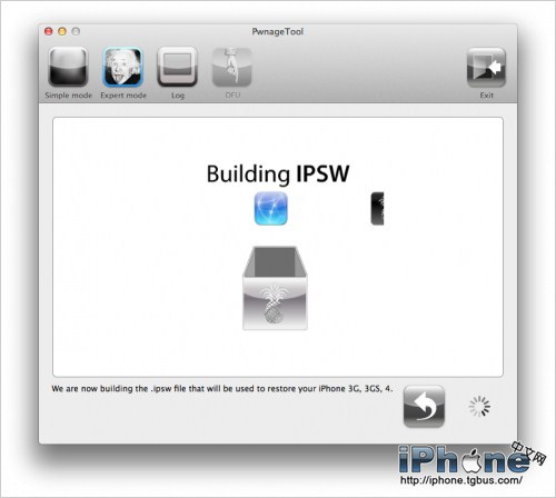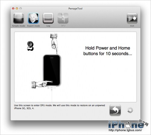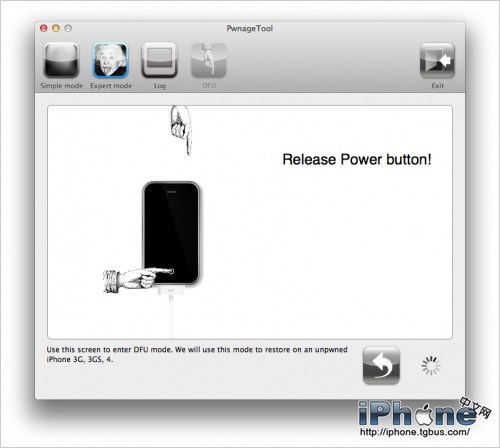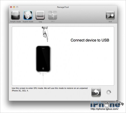 IPSW創建完成,PwnageTool會要求你將iPhone設備連入電腦,並引導你操作進入DFU模式。